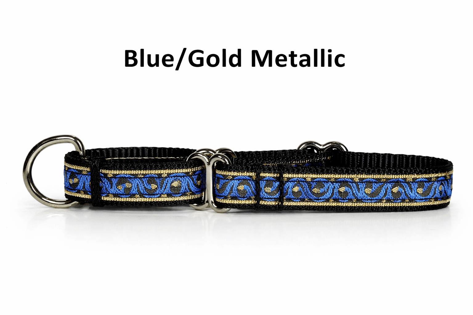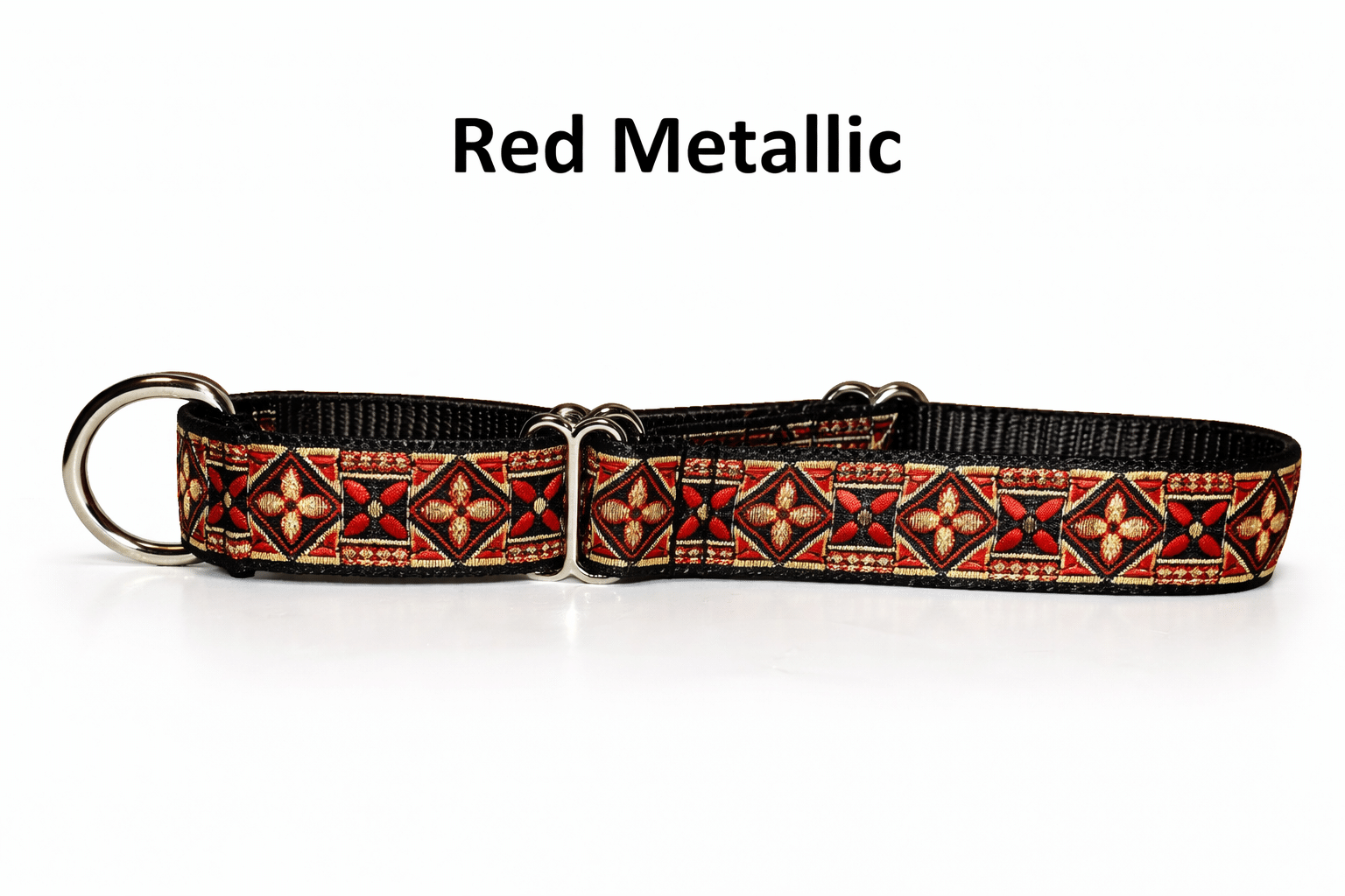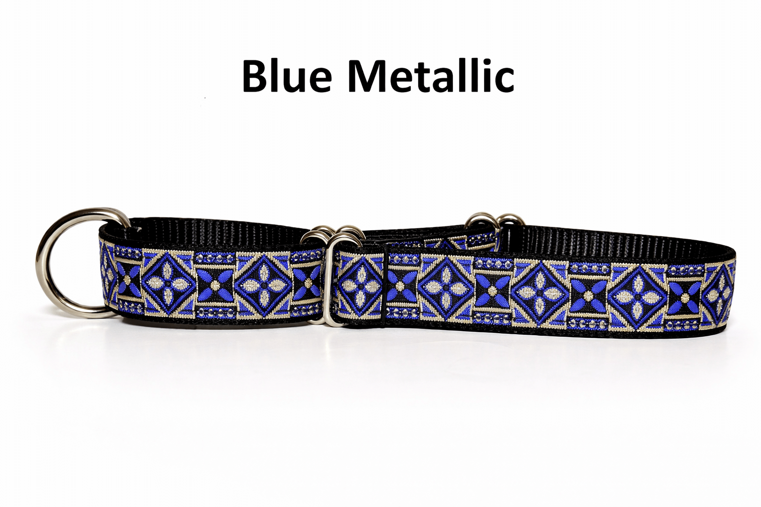 FABRIC COLLARS are the same as our standard collars, but they are covered on the outside with woven, jacquard, metallic or other fabric ribbon materials as described. Fabric collars are designed to be stylish and safe while walking your dog. They are durable, but, due to the embroidered or metallic fabric on some of the collars, the fabric could be snagged, chewed or damaged by your pet, so supervise your dog when wearing a collar. All of our martingale collars are adjustable in size. If you have any questions, please inquire before ordering. email: bellybands.net@gmail.com