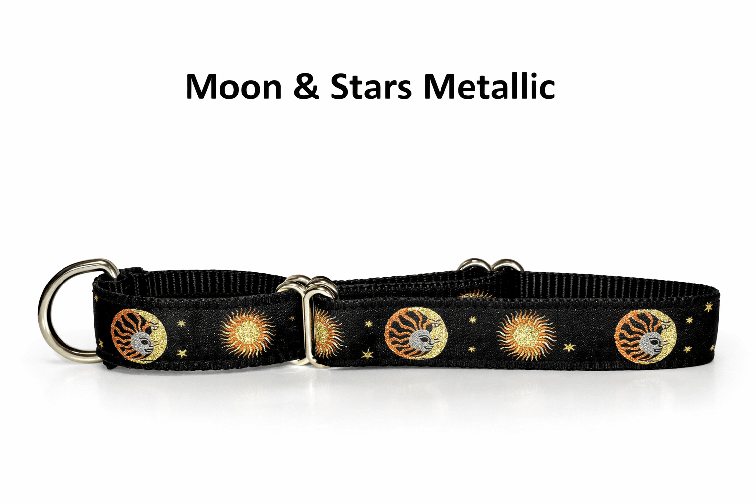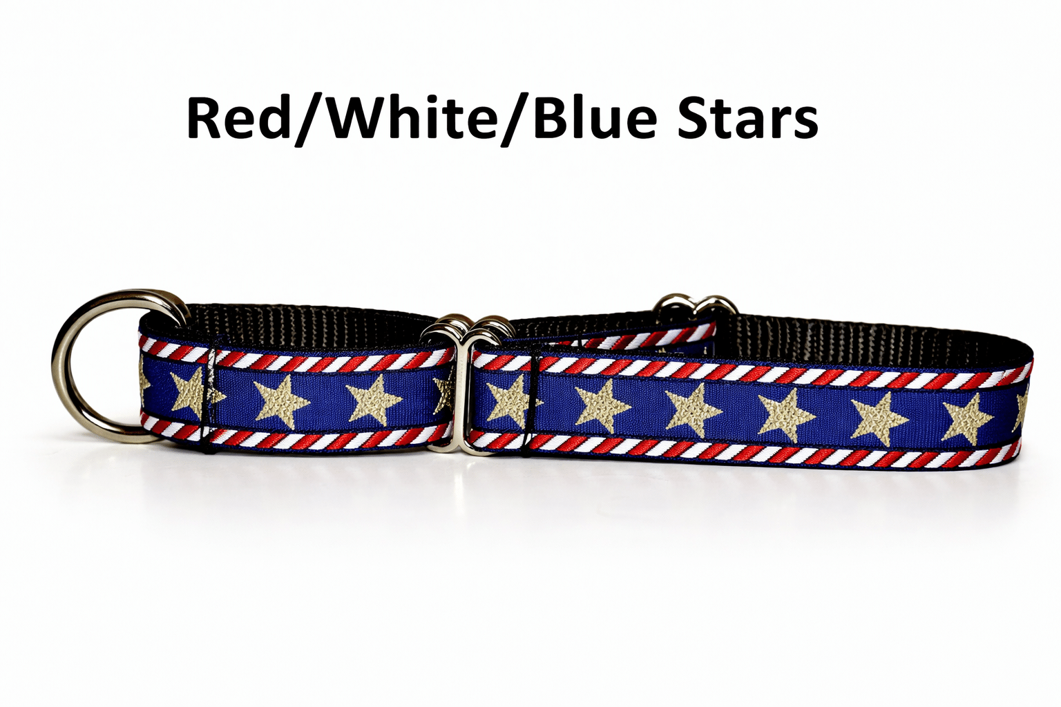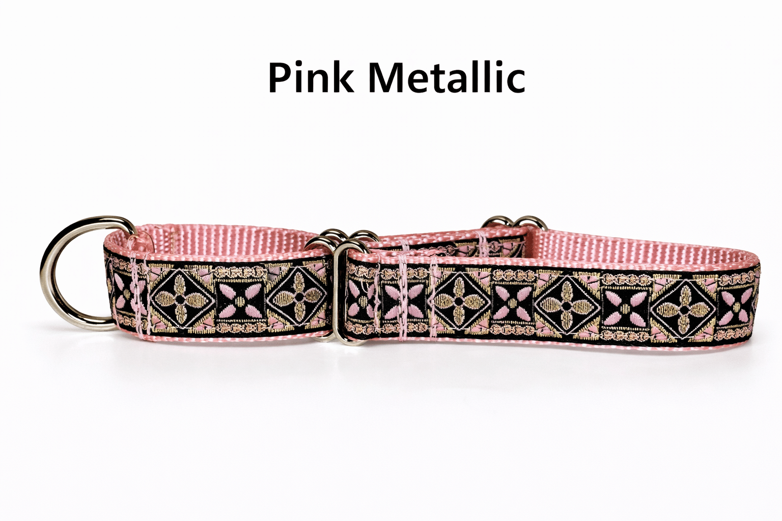 FABRIC COLLARS are the same as our standard collars, but they are covered on the outside with woven, jacquard, metallic or other fabric ribbon materials as described. Fabric collars are designed to be stylish and safe while walking your dog. They are durable, but, due to the embroidered or metallic fabric on some of the collars, the fabric could be snagged, chewed or damaged by your pet, so supervise your dog when wearing a collar. All of our martingale collars are adjustable in size. If you have any questions, please inquire before ordering. email: bellybands.net@gmail.com